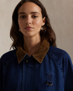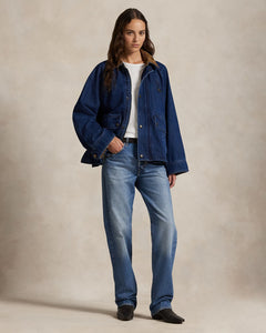 The Ralph Lauren Denim Barn Jacket Features: A timeless nod to American workwear. Designed with an oversized fit for effortless layering, this authentic barn jacket pairs durable denim with corduroy trim. Rope-dyed for a medium-dark indigo, it features a subtle high-low effect and vintage-inspired slub texture.