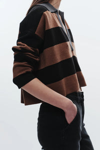 The Saint Art Samira Striped Knit Polo Features: A cropped silhouette with black and brown stripes, it’s a timeless, versatile piece—perfect on its own or layered for effortless sophistication.
