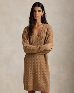 The Ralph Lauren Cable Wool-Cashmere V-Neck Sweater Dress Features: A classic cable-knit texture and a straight, slightly relaxed fit. Designed to hit above the knee, it’s finished with dropped shoulders, rib-knit cuffs, and a refined ribbed hem for an effortlessly elegant silhouette.
