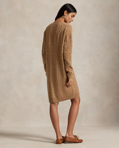 Images of the Camel Melange Cable Wool-Cashmere V-Neck Sweater Dress Courtesy of Ralph Lauren