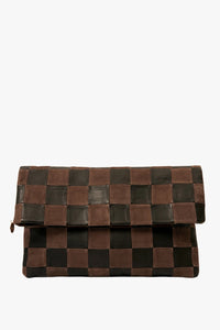 The CLARE V. Carryall Clutch Features: A clutch that is bigger than a foldover, with generous capacity, a mag snap closure, and tabs to add a strap—crafted in nappa leather and suede oversized checkers.