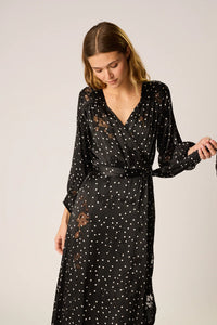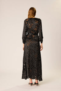 The Natalie Martin Kate Long Sleeve Dress Features: A flowing silk maxi dress featuring a crossover wrap bodice with a secure wrap closure and soft gathers at the shoulders for gentle volume. Designed with long, billowing sleeves finished with buttoned cuffs and an asymmetric hemline for fluid movement. Crafted from 100% silk in our new Midnight Burnout print—a sheer floral burnout pattern that adds depth and allure. Slip not included.