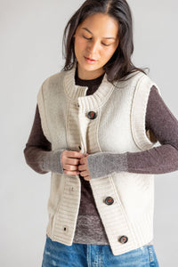 The Paychi Guh Rib Trim Vest Features: An eye-catching sweater vest crafted from 100% premium Mongolian cashmere in a soft 5-gauge knit, the Rib Trim Vest offers a relaxed fit with lowered armholes for easy layering. Finished with 3x2 rib trims, chunky buttons, exposed seams, and subtle pops of color, this versatile piece transitions effortlessly between seasons—perfect worn open or buttoned, over a tee or under a jacket.