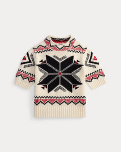 The Ralph Lauren Snowflake Mockneck Short-Sleeve Sweater Features: A short-sleeve mockneck sweater featuring a wool/cotton blend and an intarsia knit snowflake motif framed by jacquard-knit geometric borders.
