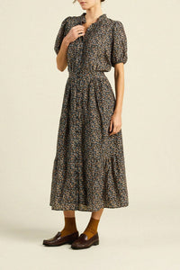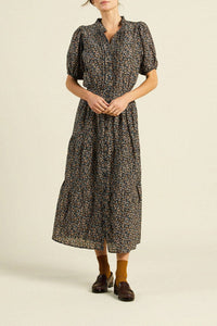 The Trovata Blair Dress Features: A vintage inspired, ditsy patterned dress in silk cotton. Featuring hidden side seam pockets, multi-tiered skirt, a front placket with antique white buttons, and a standing ruffle-collar for subtle charm.
